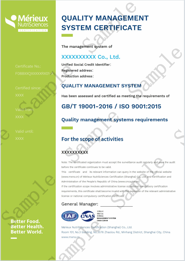 ISO9001标准规定的所有要求是通用的,旨在适用于各种类型、不同规模和提供不同产品和服务的组织。目前梅里埃可以实施的认证范围主要为食品领域,种/养殖、食品加工、餐饮服务等相关领域的认证。